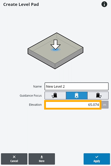 EXAMPLE – If Trimble Earthworks shows you're 65 meters above sea level and you want your pond to be 2 meters deep, adjust the level to 63 meters.