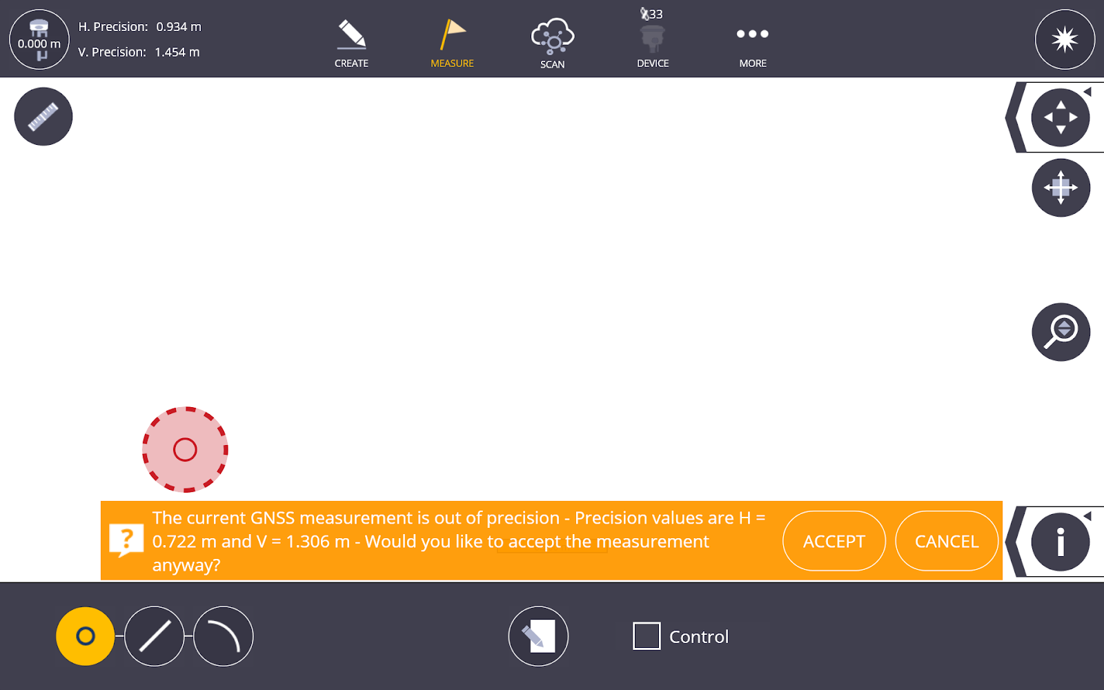 If you attempt to stake or collect a point while the receiver is out of precision and the icon above is showing in place of the receiver location, a confirmation toast will appear prompting you to confirm whether you still want to store that point.