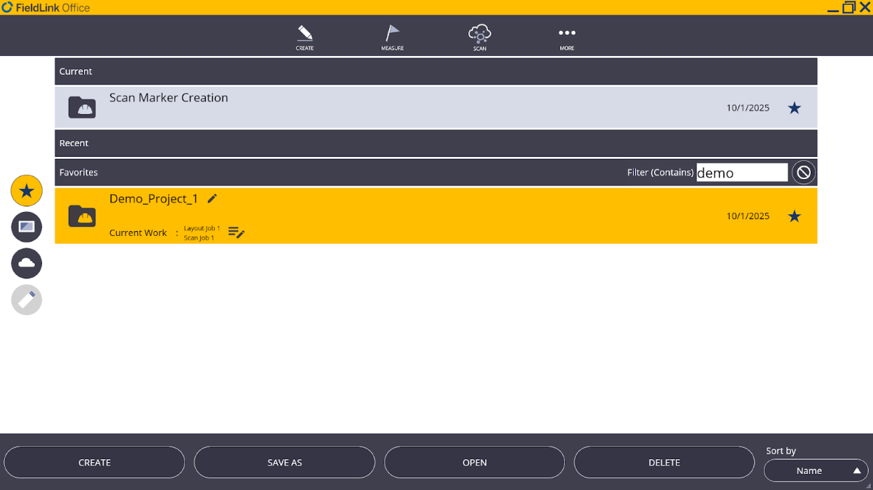 Tap the Filter (Contains) search bar to search for a project in Favorites, Local, Trimble Connect, or USB. Enter a keyword and tap Apply to pull up the search results. Select a project and tap Open.