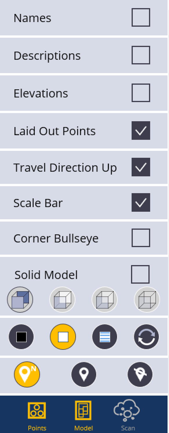 . - Make selections to display Point Name, Point Description, Point Elevation, Laid Out Points (If unselected, points will disappear off the screen once they have been laid out), Travel Direction Up (map rotates and updates as you walk to the point - Blue Diamond indicates travel direction), Scale Bar, and Corner Bullseye (Shows a corner bullseye option and full map screen while laying out points, lines or arcs).