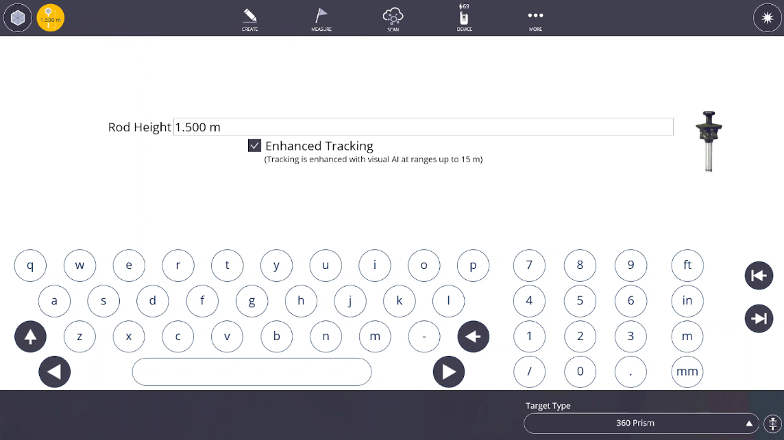 - Type in the correct height of rod (HR). Measure to the center of the prism to the tip of the rod for the 360, MT1000 and AT360 prisms. If you have an Inverted Layout Rod you can use the value displayed on preset positions.