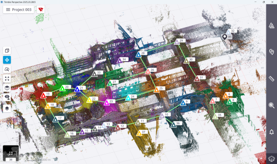 The 3D View enables you to visualize the whole scan data in free navigation. In this view, each station has a point cloud representation, with a marker (triangle) and a name (Label).