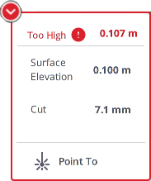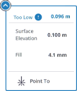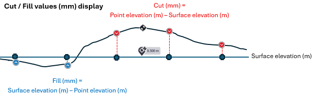 Cut/Fill Values to display the amount of material that needs to be removed from (Cut) or added to (Fill) the floor surface to achieve the desired level. Cut/Fill Values, in millimeters or inches, are always positive regardless of whether they represent a cut or a fill.