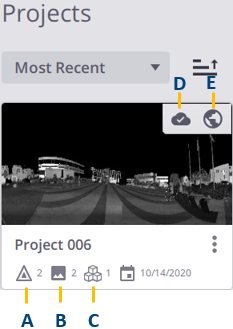 Tap All Projects from the Menu panel. The Projects page displays all available projects, each as a thumbnail. In addition to the project name and the time-stamp information, each thumbnail contains the followings:
