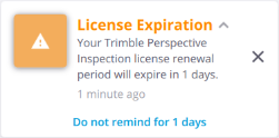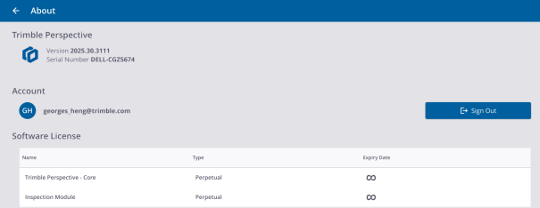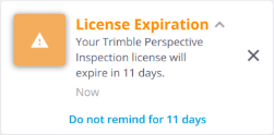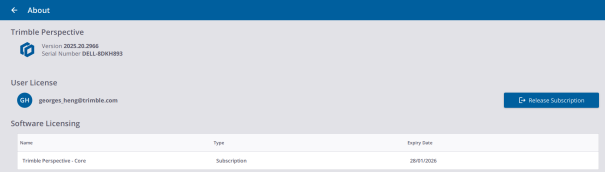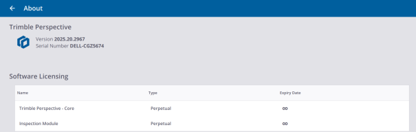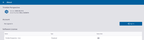 WARRANTY: Every Trimble Perspective software must be licensed in order for you to install and operate the software. A Trimble Perspective license comes with a warranty and an expiry date which is the last day of service, meaning that the warranty and the license will expire after that expiry date. New improved versions of the software require a valid warranty. If the software warranty has expired, you can continue to operate the software. The software warranty expiry date is shown only if you have a perpetual software license. If you have a subscription, you can install new, improved versions of the software as long as the subscription is valid.
