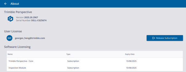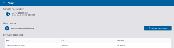 You can purchase a Trimble Perspective core software license as a perpetual license that is licensed to a controller or as a subscription license that is assigned to an individual user. A perpetual license works perpetually (there is no expiry date). A subscription license will stop working after the expiry date.