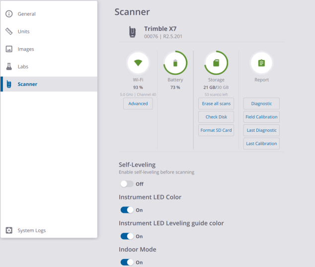 INSTRUMENT LED LEVELING GUIDE COLOR: This feature helps you level the scanner by indicating which leg on the tripod needs adjusting. See Level a Scanner.