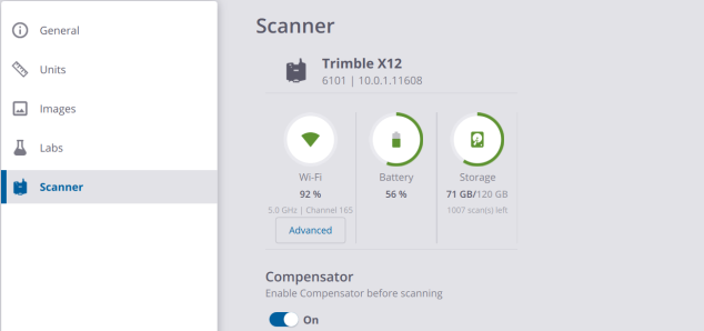 COMPENSATOR: The Compensator is a vertical compensation feature. It automatically level-compensates all 3D points when it is enabled. It is recommended to leave the Compensator on for the Tilt compensation when within a range of ±0.5°. The Compensator can be left on when scanning upside down or tilted at any angle but it will be out of range and the scans will be unleveled. The Compensator should be turned off when scanning on a fluctuating surface like a ship.