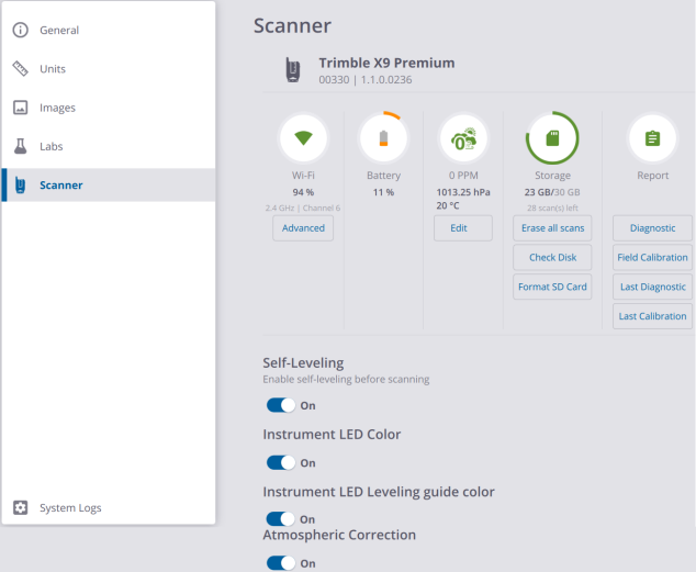 STORAGE: This panel displays the total capacity of the memory card in GB, the remaining storage capacity of the memory card in GB, and the number of allowable scans according to the current scan parameters. The Storage options are enabled only if a connection between the scanner and the controller has been set, and an SD card available in the scanner.