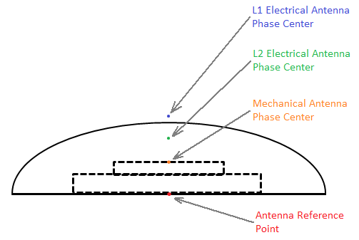 The ARP is typically the point on the centerline of the antenna at the mounting surface. Above the ARP is the Mechanical Antenna Phase Center, this is the physical point on the surface of the antenna element where the Antenna Phase Center electronics reside. In some instances, the terminology Nominal Antenna Phase Center may also be used, particularly when this point is at an arbitrary location or a location meant to coincide with similar antennas. The actual Antenna Phase Centers for L1 and L2 frequencies are points (or clouds) in space, typically above the Mechanical Antenna Phase Center.