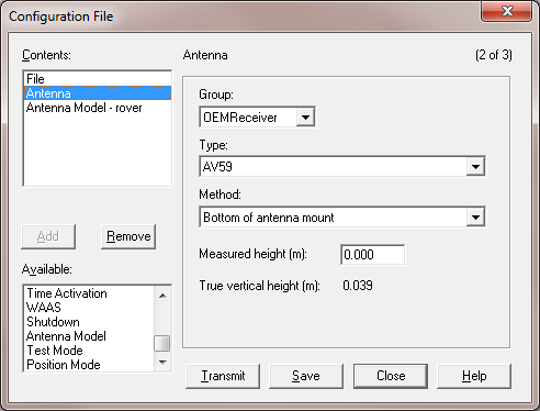 The GNSS receiver has an interface to setup the antenna type, antenna height, and antenna measurement method. The entered antenna height and antenna measurement method values are only applied when setting the GNSS receiver up as a base station, since the CMR or RTCM correction message outputs the coordinate of the base stations’ Mechanical Antenna Phase Center. However, typically only the coordinates of the ground station which the antenna is setup over are known. Entering the antenna height and antenna measurement method enables the software to calculate the height of the Mechanical Antenna Phase Center above the ground station.