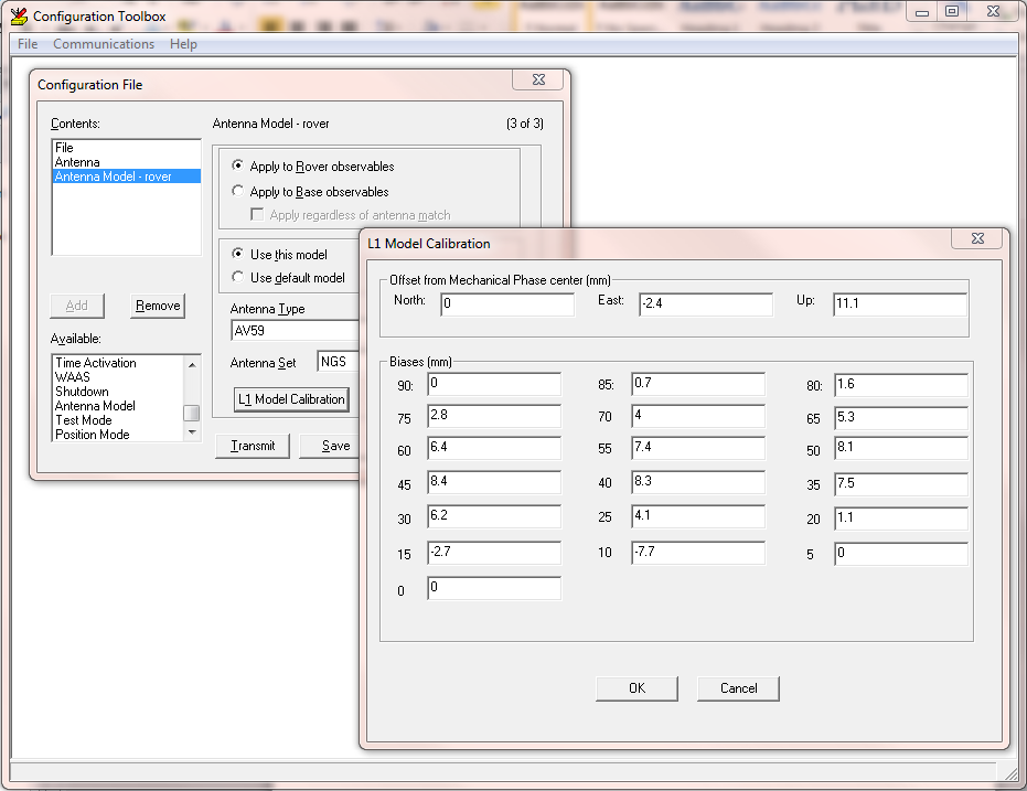 If you want to understand the location of the L1 and L2 Antenna Phase Centers with respect to the Mechanical Antenna Phase Center, add the Antenna Model page and then select the antenna type. Click the L1 Model Calibration or L2 Model Calibration button to view the offsets and the elevation-dependent tracking biases: