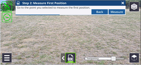 5. Navigate to the first known point. Place the SiteVision unit on top of the point and tap Measure to measure this position.. When placing a PDF horizontally, the height of the first position is used to determine the height at which the PDF will be placed (the height of the second point that you will measure in the next step is ignored; the file is placed flat / horizontal). Trimble recommends using SiteVision mounted on a pole for this step.