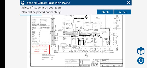 4. Select the first known point on your plan by zooming and panning to position the crosshairs at the correct location. Tap Select to confirm the point selection.