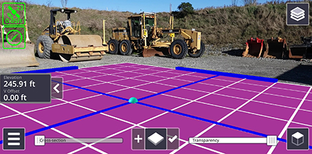 The Plane tool allows you to design flat or sloping surfaces (planes), compatible with Trimble Earthworks and Trimble Business Center. The designs are stored locally on the device and can be synchronized to Trimble Connect.
