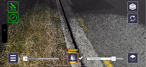 The exact area and size of scan that can be captured varies based on the device, and also the complexity of the loaded model. SiteVision will calculate the maximum size of allowable scan. Once 65% of the scan size is reached, a green progress bar appears on the screen above the icon. When the maximum scan size is between 80% and 90%, the progress bar changes to orange; between 90% and 100%, it changes to red). Scanning can continue, but will be halted once the bar completely fills up.