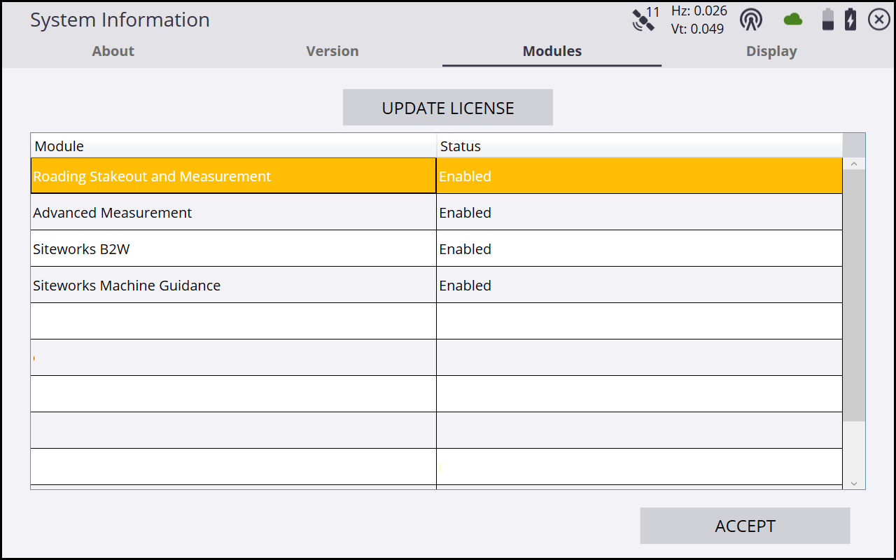 When the license is successfully installed and activated, it will show as a Siteworks B2W module in the System Information screen (select menu / Options / System Info / Modules tab).