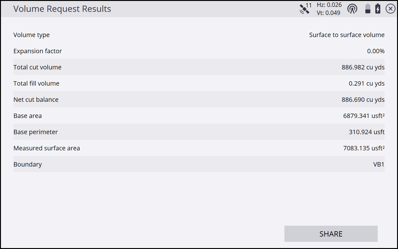 In the Volume Request screen, tap on an existing measured volume boundary or outer boundary to enable the options to create the volume measurement. On the map view: -