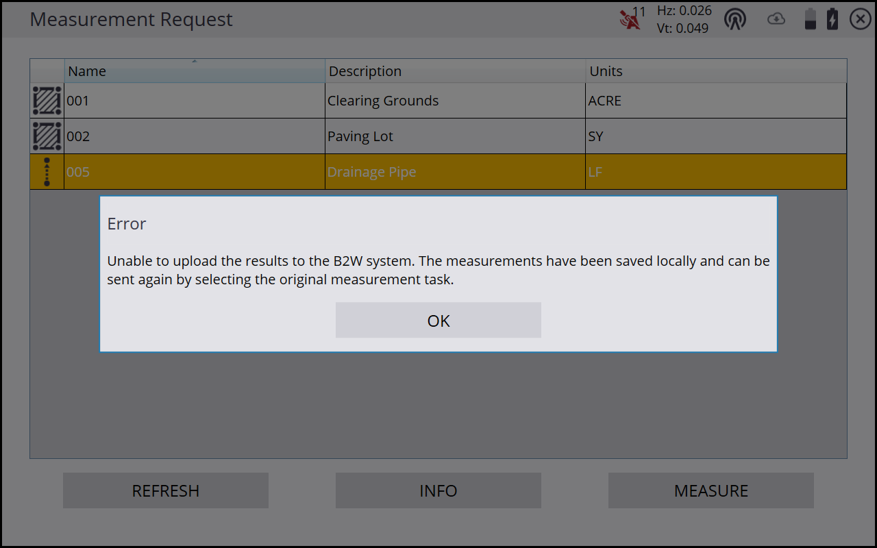 In situations where you need to take measurements and the internet will not be available, you can download the Measure Request list first on the Siteworks device while there is still an internet connection. Measurements can then be performed in the field while disconnected from the internet, and the data will be stored on the device. At the completion of the measurement task, the software will try to send the measurement to the B2W Track software. If no internet connection is available, the following message appears to inform you that the results could not be uploaded and the results will be stored locally. Selecting the measurement item again will attempt to resend the saved results.