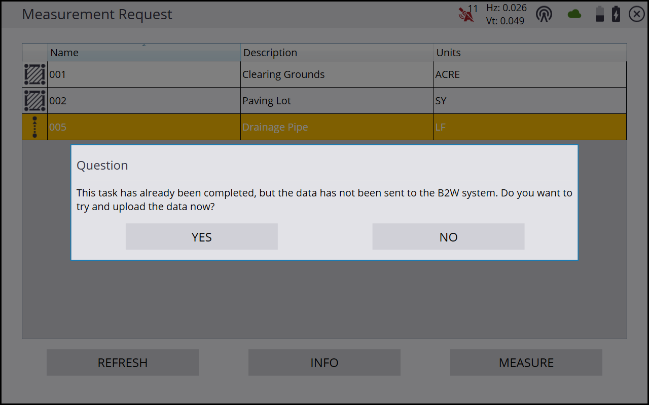 Selecting the item again in the Measurement Request list of a completed measurement while the device was offline will offer the following option. Tap YES to upload the saved data.