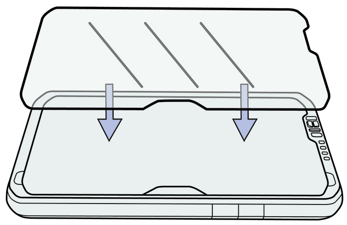 Align the screen protector with the glass portion of the display. Use the edge of the display as a guide. The screen protector should line up evenly with the edge of the keypad and the edges of the device. -