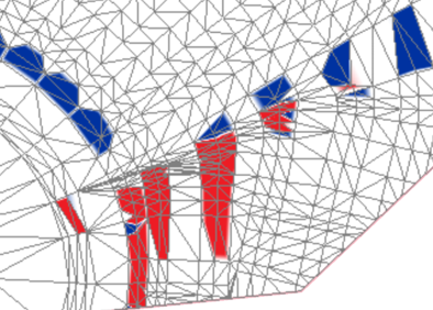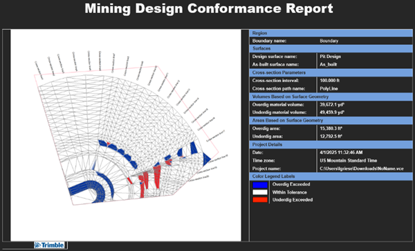 Use the Mining Design Conformance Report command to create a mine production report that compares an as-built surface with the design surface to provide extraction progress to stakeholders. After running the command, a colorized surface model is created as a result of comparing the design and as-built surface based on specified parameters and tolerances. The report includes a 2D overview of the surface model with cross sections and a table containing the calculated area and volume.