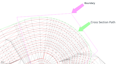 The following image shows the selected Boundary (1) and Cross-section path (2) to be used for a report.