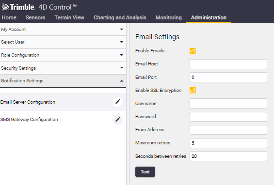 In T4D Web go to Administration > Accounts > Notification Settings > Email Server Configuration.