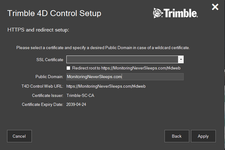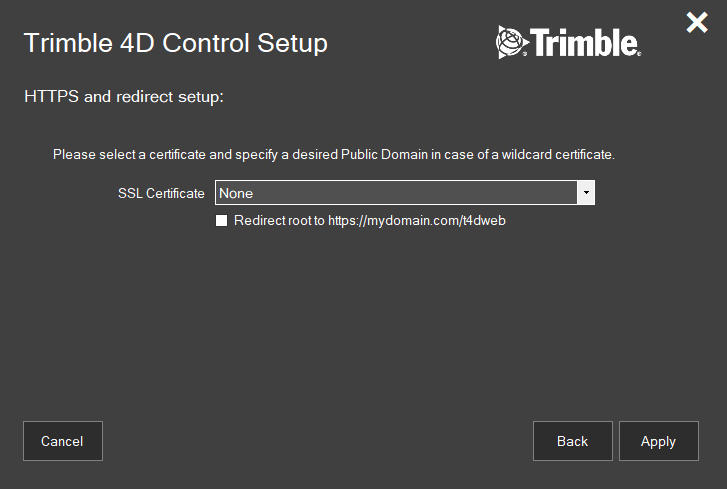 This window lists automatically all SSL Certificates available on the server.A .pfx certificate file is required. If the SSL Certificate is not available, please install or import it now onto the server. Reopening the Trimble 4D Setup Bootstrapper, the newly added certificate should now appear in the drop-down list.