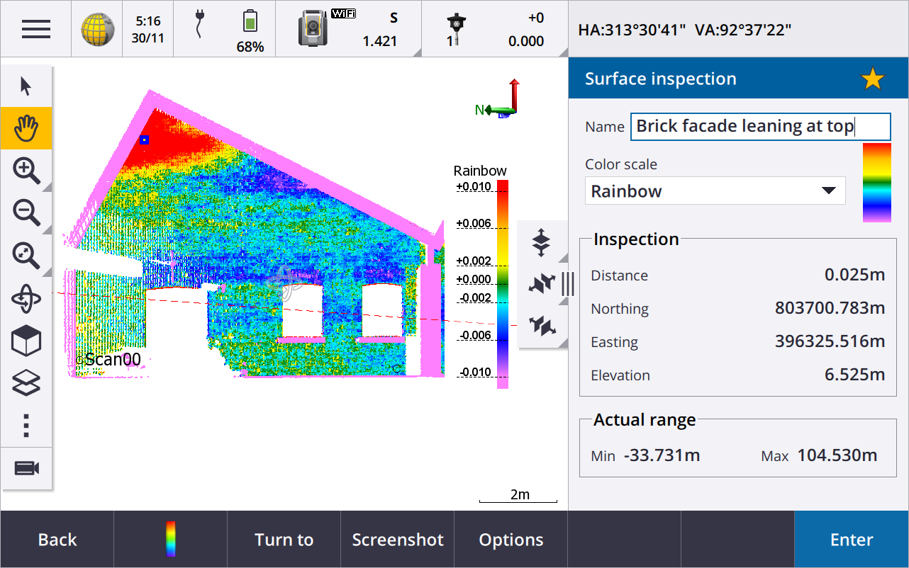 Points in the inspection point cloud are color-coded to provide immediate visual feedback between the point cloud and the reference surface. When inspecting a brick facade, for example, you will be able to see whether any sections of the facade are showing signs of movement off vertical.