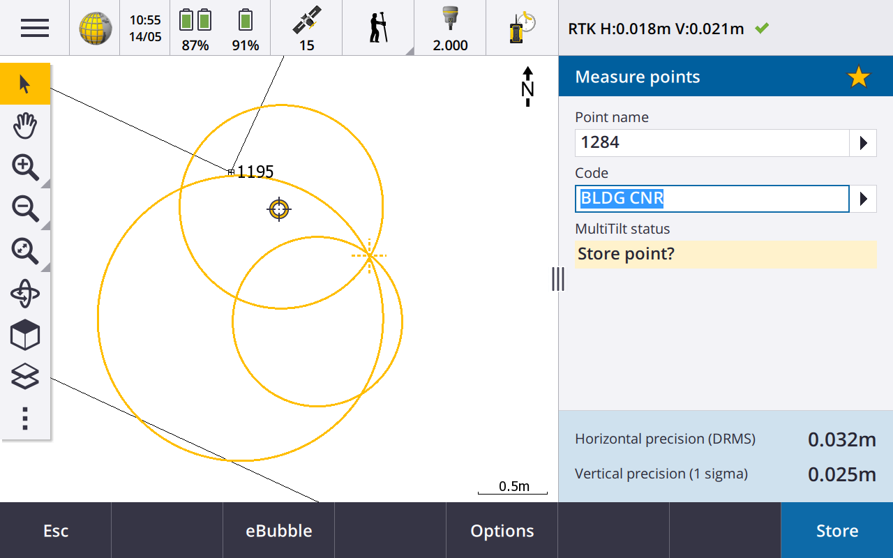 Lors de l’utilisation d’un récepteur GNSS avec Fonctions d’inclinaison activées dans le type de levé et une eBulle calibrée correctement, vous pouvez utiliser la nouvelle méthode de mesure Point à multi-inclin pour mesurer un point utilisant trois mesures d’eBulle inclinées contribuant dans des emplacements où vous ne pouvez pas niveler la canne.