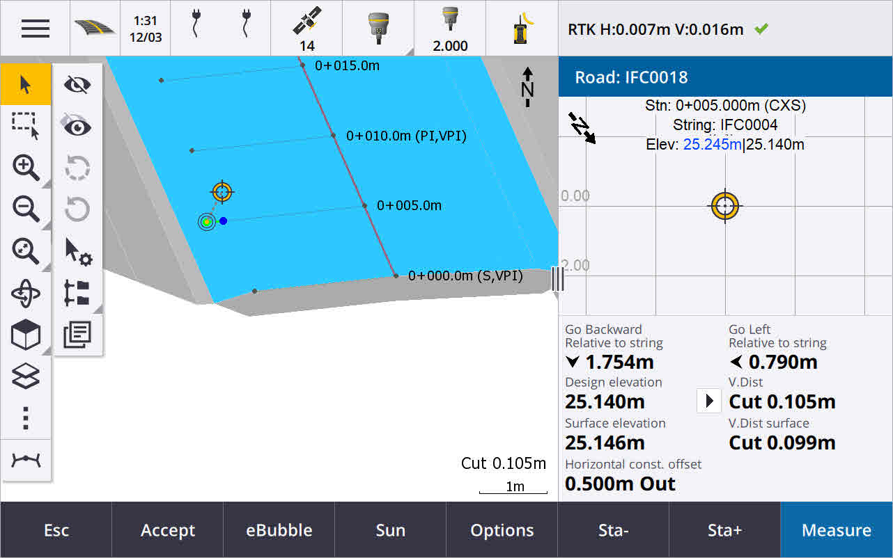放样线、弧或多义线时,可以更轻松地直接从放样屏幕访问从表面计算挖/填的选项。在放样屏幕中,启用挖/填到表面开关并选择表面。在以前的版本中,表面选择是从选项访问的,称为DTM。