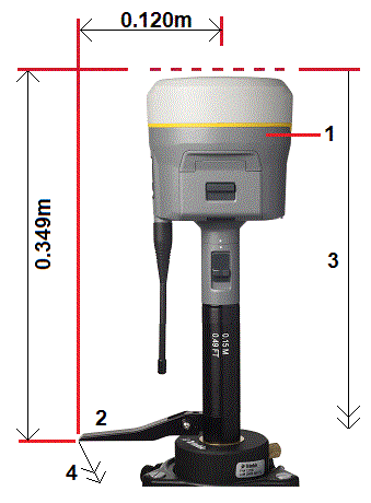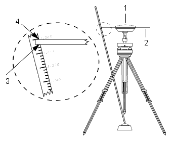 请参考下图,其中:(1)是接收机,(2)是 延伸杆,(3)是从地面标记到 APC 的修正高度,(4)是未修正的高度。