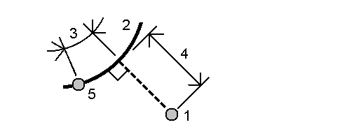 Tuloksena saadaan etäisyys kaaren suuntaisesti (3) ja kohtisuoraan kaareen nähden (4). Etäisyys kaaren suuntaisesti on laskettu annetusta pisteestä (5).