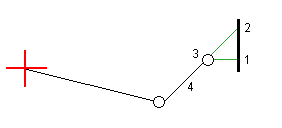 下の図は、キャッチポイント(3)に適用される、水平オフセット(1)、勾配前オフセット(2)を示しています。勾配前オプションでは、オフセットの勾配は、サイドスロープ(4)によって定義されます。図の「鉛直オフセット」値は「0.000」です。