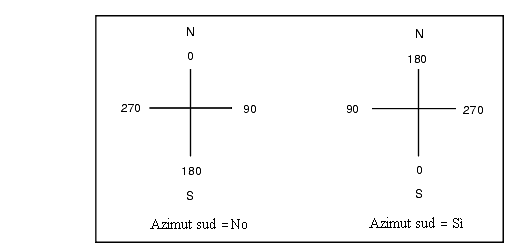 Se per il sistema di coordinate selezionato è necessaria la visualizzazione di un azimut sud, il campo Azimut sud è impostato su Sì. Tutti gli azimut azimut aumentano ancora in senso orario. Il diagramma seguente mostra l'effetto quando il campo Azimut sud è impostato su No o Sì.