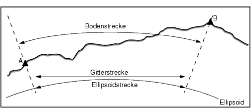 Eine Bodenstrecke ist die horizontale Strecke, die zwischen den beiden Punkten bei durchschnittlicher Höhe parallel zum gewählten Ellipsoid berechnet wird.