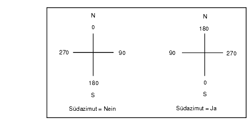 Wenn für das gewählte Koordinatensystem ein Südazimut angezeigt werden soll, wird das Feld Südazimut auf Ja eingestellt. Alle Azimuts werden weiterhin im Uhrzeigersinn erhöht. Die folgende Grafik zeigt den jeweiligen Effekt, wenn das Feld Südazimut auf Nein oder Ja eingestellt ist.