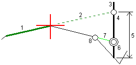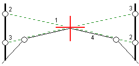 When using a cross slope, typically a wire (1) is stretched from one side of the road to the other fixed at position (2) on each stake. The wire is then checked to see that it lies on the formed road surface (4). The process is then repeated for the other side of the road by fixing the wire to the stakes at position (3). The cross slope can be offset vertically so that the wire is above the surface making it easier to confirm the construction. If the cross slope is offset, the measured distance from the wire to the surface should be consistent. The cross slope option reports the deltas, enabling the stake to be marked up with positions (2) and (3).