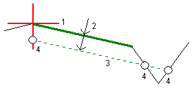 The selected line (1) appears as a bold green line. The depth to subgrade (2) is from the selected line to the subgrade surface. A dashed green line (3) extends to intersect with all encountered lines in the cross section. If no intersection(s) are found, computed points are created at the same start and end offsets as that of the selected line. The single circles (4) indicate the computed positions.
