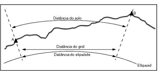 Se um elipsóide foi definido no trabalho e o campo Distâncias for configurado para Solo, a distância é calculada paralela a ele. Se nenhum elipsóide foi definido, o elipsóide WGS‑84 é usado.