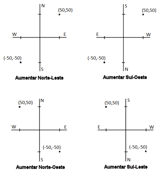 A configuração de direção da coordenada de grade usada pelo software depende do sistema de coordenadas que você definiu para o trabalho atual. O campo Coords Grade mostra que as coordenadas de grade aumentam em um dos seguintes conjuntos de direções: