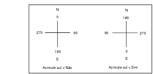 Se um azimute sul for requerido para o sistema de coordenadas selecionado, o campo Azimute sul é configurado como Sim. Todos os azimutes ainda aumentam no sentido horário. O diagrama a seguir mostra o efeito quando o campo Azimute sul é configurado como Não ou Sim.