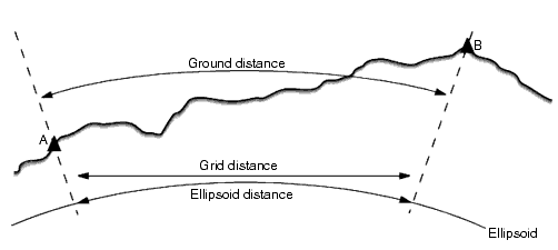 Расстояние на земной поверхности - это расстояние в плане, вычисленное между двумя точками на средней высоте параллельно выбранному эллипсоиду.