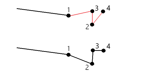 Например, рассмотрим следующий рисунок, показывающий вид поперечника для бордюра и водосточного канала, где секции 2 и 3 на верхнем рисунке имеют одинаковое смещение и потенциально могут быть соединены неправильно, как показано красной линией. На нижнем рисунке, где секция 3 задана с небольшим смещением от секции 2, секции всегда будут соединяться правильно, как показано черными линиями.