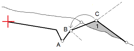 Följande diagram visar ett typexempel på var man eventuellt väljer en ny väglinje som släntkrön. I det här exemplet, har originaldesignen med släntkrönsväglinje vid väglinje C fyllts, vilket har resulterat i en oönskad fyllningszon (1). Genom att välja B som släntkrönsväglinje, kommer den nya designen att skäras och den oönskade fyllnadszonen undantas.