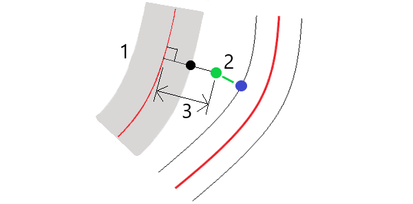 在主要道路(2)上的所选位置的次要道路(1)上计算的桩号值以及从所选位置到次要道路的计算的偏移量(3)显示在屏幕的顶部: