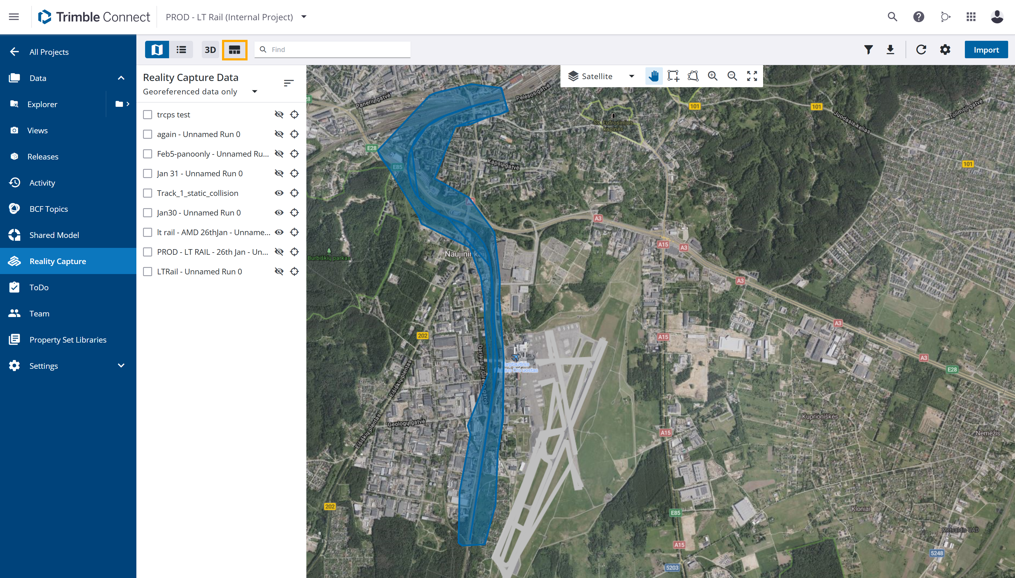 If Point Cloud data is available: Go to Trimble Connect > Reality Capture tab, select a dataset, and in the details tab that opens on the right side select the small arrow beside 'View in 3D'. Then select View in Multi-pane from the drop-down menu.