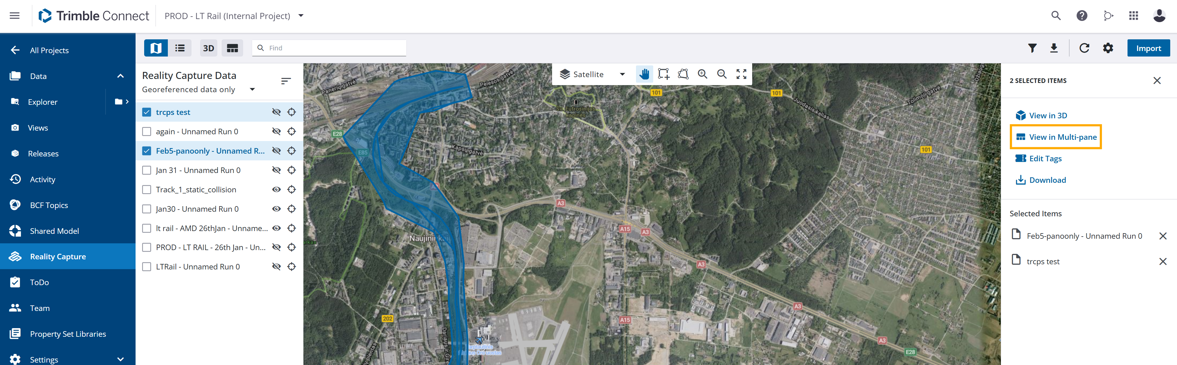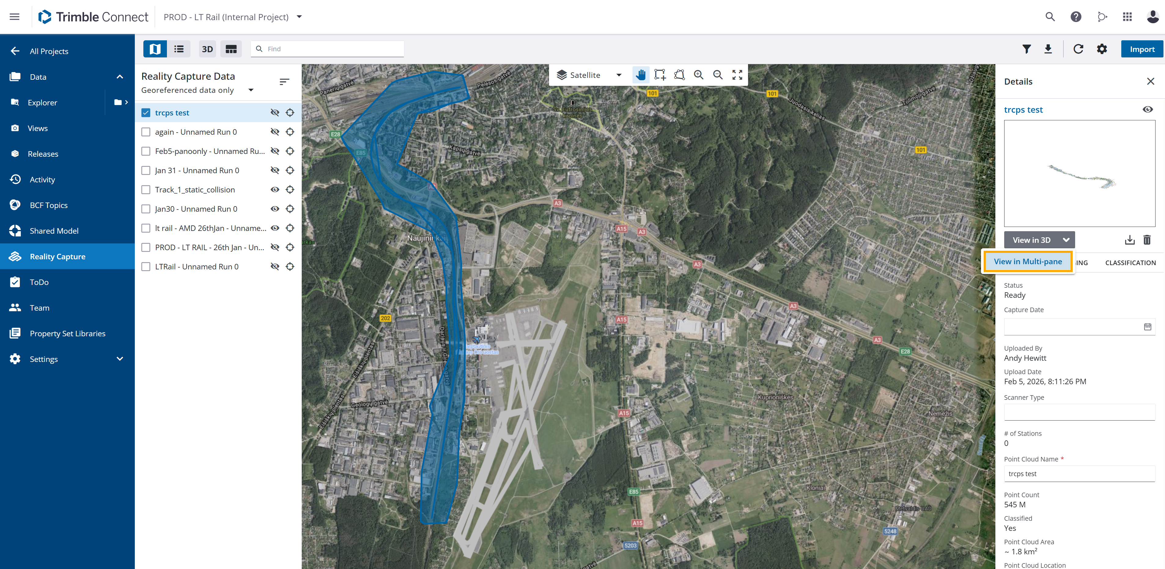 If Mobile Mapping data is available: Open Trimble Connect > Reality Capture, select a dataset, and in the details tab that opens to the right side choose View in Multi-pane from the drop-down menu.