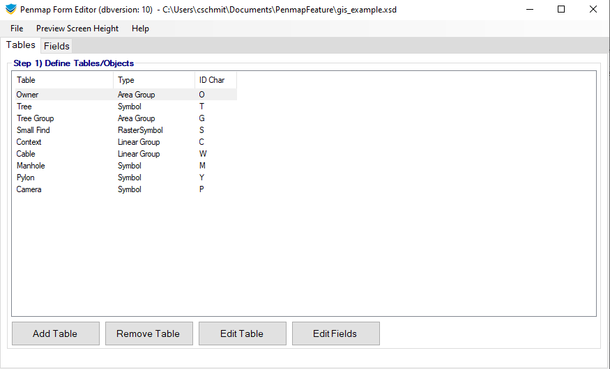Use the editor to add or remove tables of features/objects.